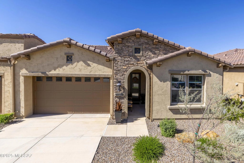 This stunning Viva model truly has it all! Nestled in the newest Villa section, this 4-year-old home offers modern & luxurious upgrades. Step inside to discover a highly upgraded villa with a contemporary kitchen featuring Restoration Hardware designs throughout. The chef's kitchen features an oversized farmhouse apron sink, wall ovens/microwave, a high-performance cooktop, quartz countertops & large island. Spacious den/office. The walk-in curbless shower is luxurious. Garage has an epoxy floor & a tankless water heater. The large, extended courtyard features a covered patio and overlooks a lush, common grass area, creating an outdoor retreat with views of the Catalina Mountains and stunning sunsets. Don't miss this opportunity to live the dream at SaddleBrooke Ranch!