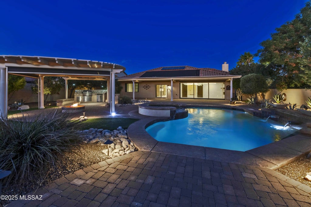 Explore this beautifully custom designed private oasis offering the ultimate in comfort and elegance. Luxurious secluded resort style backyard has expansive pergolas providing shaded retreats while a sparkling pool and spa invite you to unwind in refreshing coolness. Inside the custom-designed kitchen features Sub-Zero, Bosch, & Wolf appliances. The buffet breakfast bar is ideal for effortless entertaining, seamlessly connecting to the spacious dining area & great room. Adjacent family room can be made cozy by the fire or, anchored by a dramatic window wall, opens up gracefully to the rear patio & lush yard beyond. A spa-inspired bathroom showcases a curbless shower & dual custom walk-in closets. Thoughtful upgrades enhance every corner of the home! Come see true luxury for yourself!