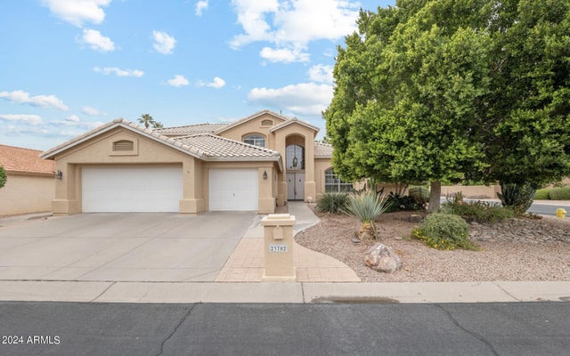 This Sun Lakes home is ready for new owners! Located in the highly sought-after gated community of Oakwood you will love the lifestyle this home has to offer! This stunning home has a NEW ROOF, bright, spacious floor plan with over $30k in upgrades! The downstairs primary bedroom features 2 walk-in closets, a curbless shower, and a separate jacuzzi tub. On the main level you also have a bedroom, full bathroom, and laundry room. Enjoy cooking and entertaining in your open kitchen/living area, with huge island and built-in appliances with custom cabinetry. The backyard is perfect for year round enjoyment with a large covered patio, water feature, fire pit, and private hot tub. Golf enthusiasts will love the proximity to the golf course, club house and all the amazing amenities