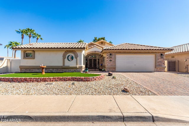 Find your ideal retirement home in the 55+ Sun Village! This charming 3-bedroom property is perfectly nestled on a corner lot, backing to the golf course with fully owned solar. Great curb appeal with stone accent details, artificial turf, a gated paver courtyard, & a 2-car garage w/paver driveway. The inviting interior features vaulted ceilings, tons of natural light, designer paint, and tile & wood flooring in all the right places. Formal dining room & welcoming living room w/fireplace! The kitchen has granite counters, mosaic tile backsplash, track lighting, ample cabinetry, and a breakfast nook. The double-door main bedroom boasts a bay window and an ensuite with dual sinks, a walk-in closet, & backyard access. PLUS! This gem offers a Casita with its own walk-in closet, full bathroom, and double-door entry. Check out the backyard with an extended paver-covered patio, where you can relax while enjoying BBQ! Its view fence lets you watch golfers on the 2nd hole, adding a touch of serenity to the setting. The Sun Village offers resort-style living at its finest, featuring a beautiful pool w/waterfall, sports courts, a public restaurant, entertainment, and a variety of other amenities for a vibrant & active lifestyle. Don't miss this opportunity!