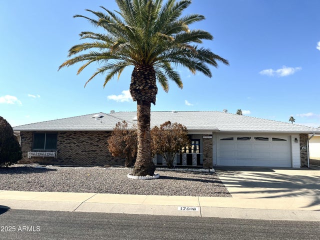 Experience delightful adult living in Sun City! This charming 2-bedroom residence welcomes you with a 2-car garage and a lovely brick facade. The living room features skylights for abundant natural light and carpeting for added comfort. The eat-in kitchen comes with flat-panel cabinetry, built-in appliances, and a two-tier island with a breakfast bar. Spend sun-drenched afternoons in the sunroom, providing the perfect spot for enjoying the warm Arizona weather year-round. The cozy main bedroom includes a convenient walk-in closet and a private bathroom. Settle into a comfortable lounge chair and enjoy the peaceful backyard. Desirable location close to churches, golf courses, recreation centers, dining, and shopping. Make it yours!